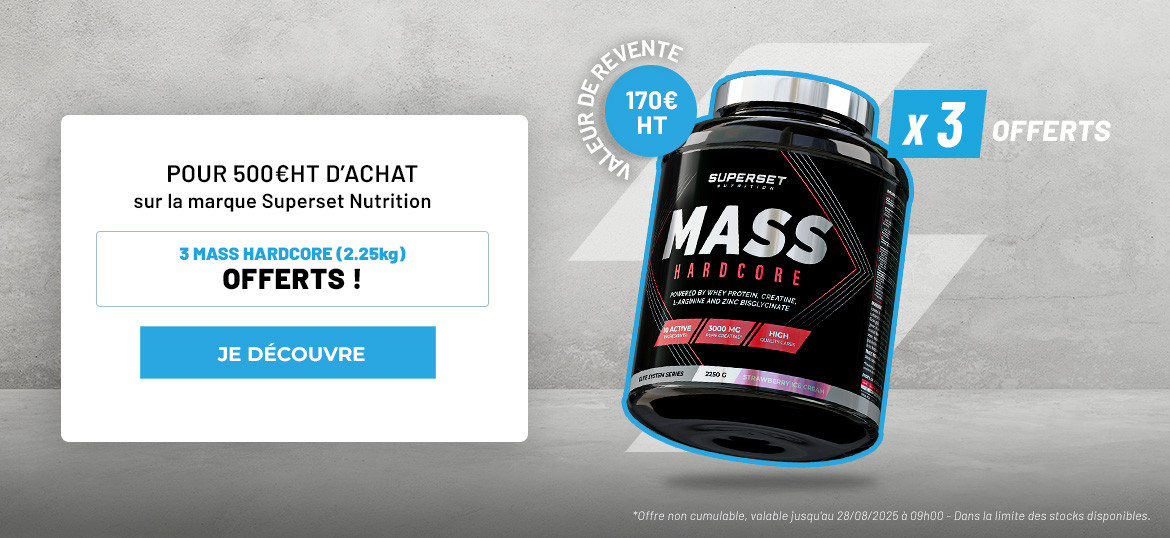 Le site Fitadium Pro est exclusivement réservé aux professionnels (revendeurs. magasins de diététiques. salles de sport. distributeurs. détaillants…). Fitadium Pro met à votre disposition un catalogue produits contenant plus de 2500 références de nutrition et accessoires de fitness et de musculation. à destination de votre clientèle sportive : protéines. brûleurs de graisse. gainers. boosters. créatines. acides aminés. vitamines. vêtements. gants. ceintures. sangles... Vous souhaitez revendre des produits de qualité. contrôlés et certifiés aux normes européennes. sûres et fiables. inscrivez-vous dans l’espace pro Fitadium Pro et créez votre compte pour gérer vos commandes en direct. Des offres spéciales. des tarifs professionnels et des conditions particulières vous sont réservés sur vos achats en ligne de toutes nos marques distribuées.