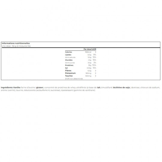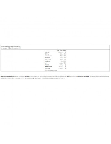 Ingrédients Vanille: farine d’avoine (gluten), concentré de protéines de lactosérum ultrafiltrée (à base de lait, émulsifiant: lécithine de soja), dextrose, chlorure de sodium, arôme (vanille), taurine, édulcorants (acésulfame K, sucralose), épaississant (gomme de xanthane).