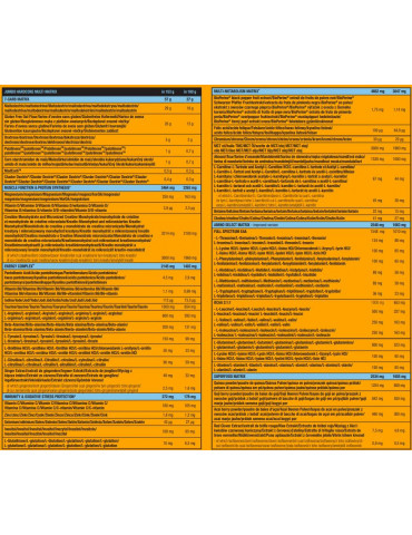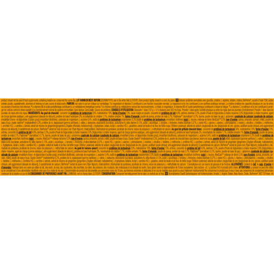 Ingrédients Chocolat blanc croustillant : concentré de protéines de lactosérum (lait) 33%, maltodextrine 19%, farine de flocons d'avoine 13%, cacao maigre en poudre, concentré de lait 4,8%, arômes, dextrose 3,3%, protéine de boeuf hydrolysée 2%, monohydrate de créatine 1,1%, créatine anhydre 1%, farine d'amande, farine de quinoa, amidons de maïs 0,7%, isomaltulose 0,7%, taurine, poudre de baies de goji, L-glutamine, caséinate de calcium instantané (lait) [caséinate de calcium (lait), émulsifiant (mono- et glycérides d'acides gras)], émulsifiant (lécithines), L-arginine 0,4%, instant isolat de protéine de lactosérum (lait) 0,3%[isolat de protéine de lactosérum (lait), émulsifiant [lécithines (soja)]], L-Leucine, mélange de farine (son d'avoine, quinoa, amarante, sarrasin, millet) 0,3%, poudre de baie d'açaï, dextrine cyclique (maltodextrine) 0,3%, protéines de riz, chocolat blanc en poudre (saccharose, beurre de cacao, poudre de lait entier), épaississant (gomme xanthane), L-valine, L-Isoleucine, anti-agglomérant (dioxyde de silicium), vitamine C (L-ascorbique), L-tyrosine, édulcorants (sucralose, acésulfame K), L-thréonine, choline bitartre 0,07%, chlorhydrate de L-lysine , Glycine, L-alanine, L-phénylalanine, inositol, L-citrulline, L-histidine, L-méthionine, chlorhydrate de L-ornithine, L-carnitine L-Tartrate, extrait de préparation de gingembre [extrait de rhizome de gingembre (zanziber officinale), maltedextrine], bétaïne 0,02%, acétyl L-carnitine, L-glutation, acide pantothénique (D-pantothénate de calcium), Bioperine extrait de fruits de poivre noir (Piper nigrum) 0,001%, vitamine D (cholécalciférol), vitamine B6 (chlorhydrate de pyridoxine), acide folique (L-méthylfolate de calcium).