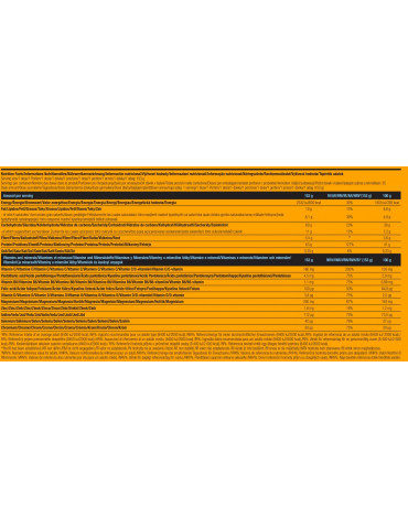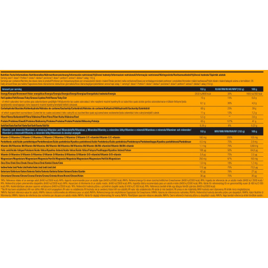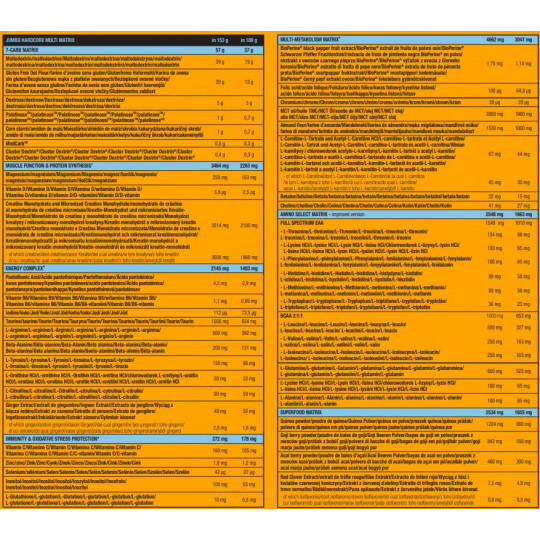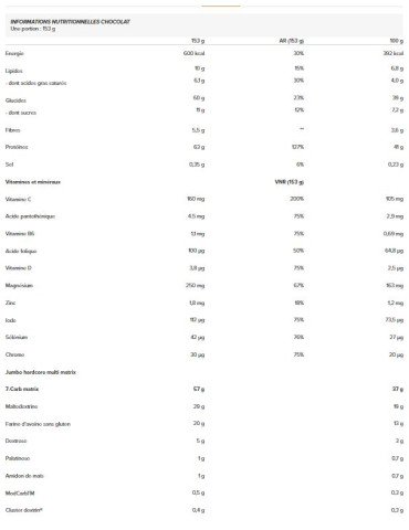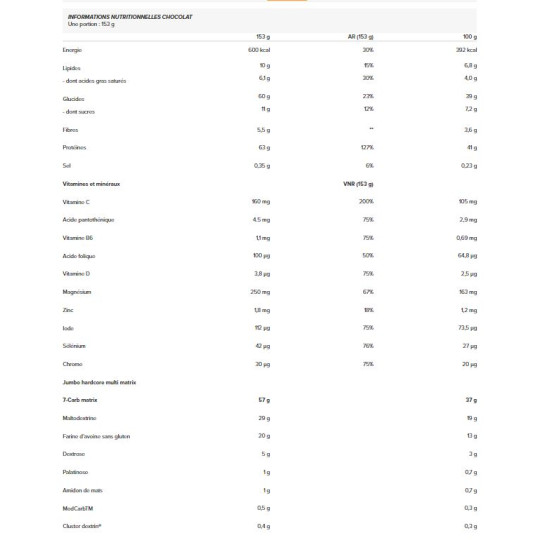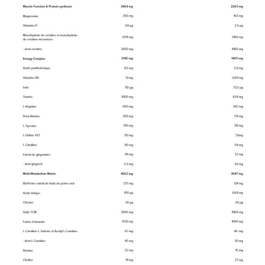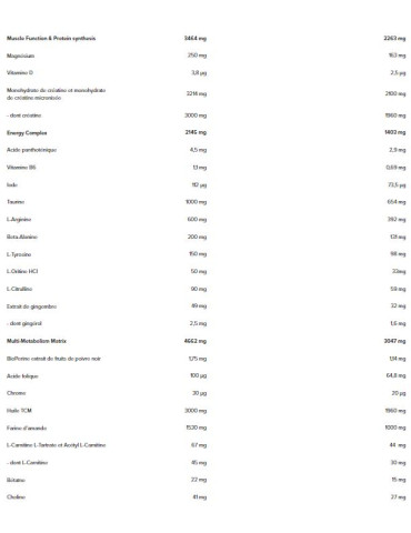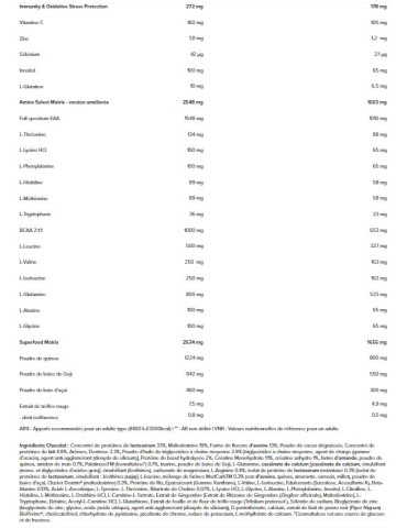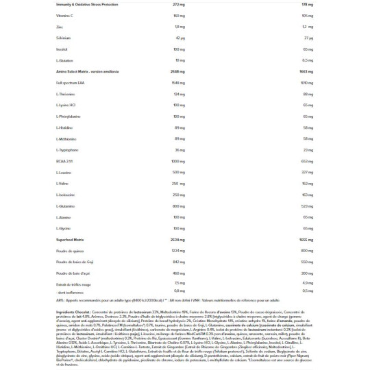 Ingrédients Chocolat : concentré de protéines de lactosérum (lait) 33%, maltodextrine 19%, farine de flocons d'avoine 13%, cacao maigre en poudre, concentré de lait 4,8%, arômes, dextrose 3,3%, protéine de boeuf hydrolysée 2%, monohydrate de créatine 1,1%, créatine anhydre 1%, farine d'amande, farine de quinoa, amidons de maïs 0,7%, isomaltulose 0,7%, taurine, poudre de baies de goji, L-glutamine, caséinate de calcium instantané (lait) [caséinate de calcium (lait), émulsifiant (mono- et glycérides d'acides gras)], émulsifiant (lécithines), L-arginine 0,4%, instant isolat de protéine de lactosérum (lait) 0,3%[isolat de protéine de lactosérum (lait), émulsifiant [lécithines (soja)]], L-Leucine, mélange de farine (son d'avoine, quinoa, amarante, sarrasin, millet) 0,3%, poudre de baie d'açaï, dextrine cyclique (maltodextrine) 0,3%, protéines de riz, épaississant (gomme xanthane), L-valine, L-Isoleucine, anti-agglomérant (dioxyde de silicium), édulcorants (sucralose, acésulfame K), vitamine C (L-ascorbique), L-tyrosine, L-thréonine, choline bitartre 0,07%, L-lysine hidroklorid, Glycine, L-alanine, L-phénylalanine, inositole, L-citrulline, L-histidine, L-méthionine, chlorhydrate de L-ornithine, L-carnitine L-Tartrate, extrait de préparation de gingembre [extrait de rhizome de gingembre (zanziber officinale), maltedextrine], bétaïne 0,02%, acétyl L-carnitine, L-glutation, acide pantothénique (D-pantothénate de calcium), Bioperine extrait de fruits de poivre noir (Piper nigrum) 0,001%, vitamine D (cholécalciférol), vitamine B6 (chlorhydrate de pyridoxine), acide folique (L-méthylfolate de calcium).