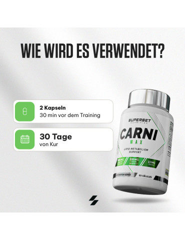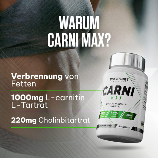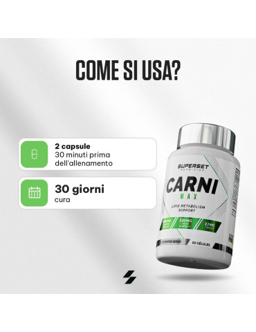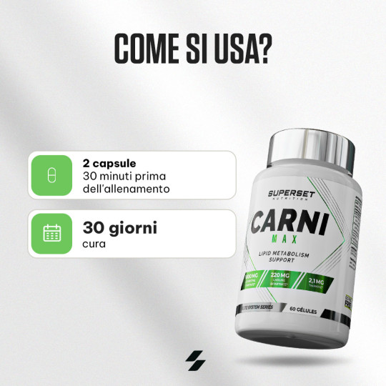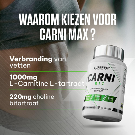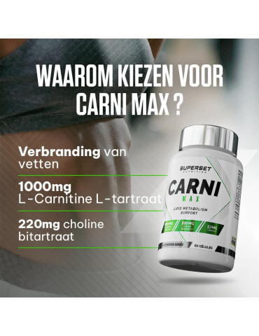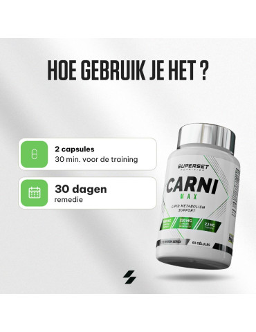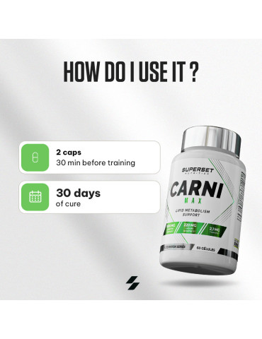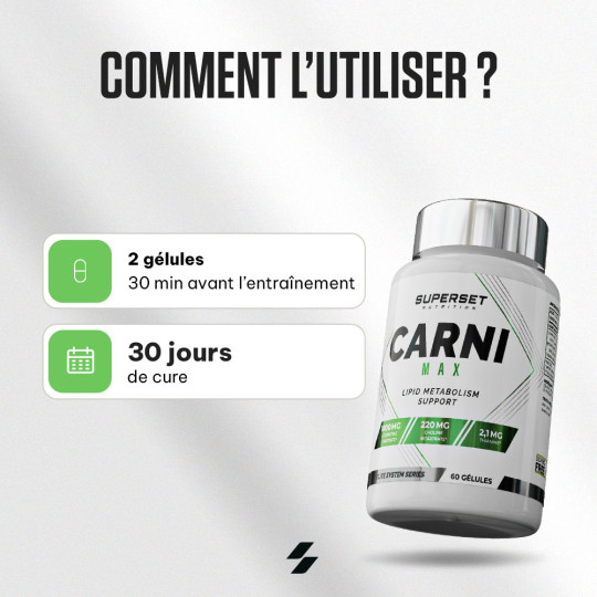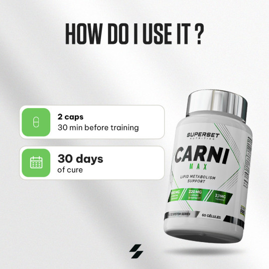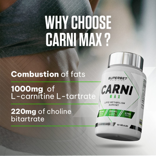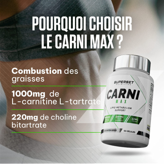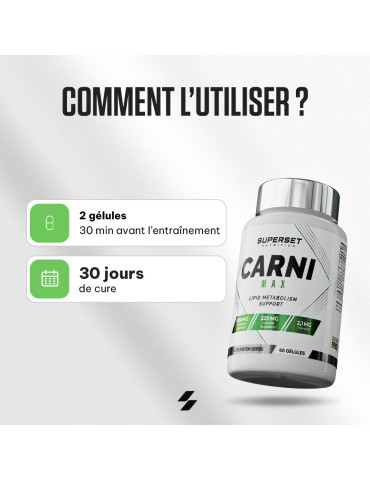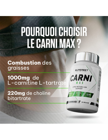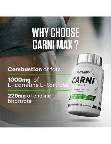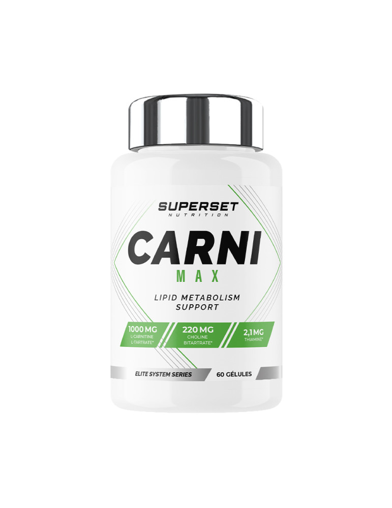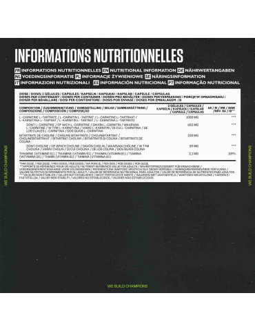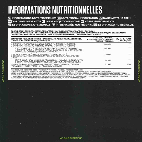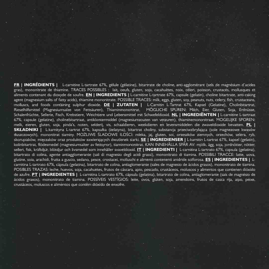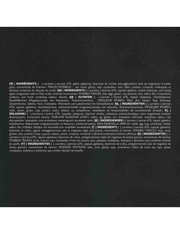 Ingrédients : L-carnitine L-tartrate 67%, gélule (gélatine), bitartrate de choline, anti-agglomérant (sels de magnésium d'acides gras), mononitrate de thiamine.
