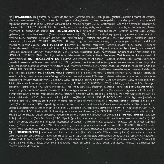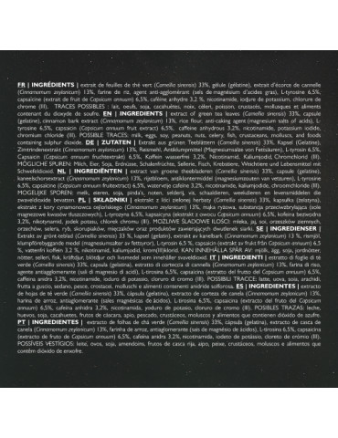 Ingrédients : extrait de feuilles de thé vert (Camellia sinensis) 33%, gélule (gélatine), extrait d’écorce de cannelle (Cinnamomum zeylanicum) 13%, farine de riz, agent anti-agglomérant (sels de magnésium d'acides gras), L-tyrosine 6,5%, capsaïcine (extrait de fruit de Capsicum annuum) 6,5%, cafeine anhydre 3,2 %, nicotinamide, iodure de potassium, chlorure de chrome (III).