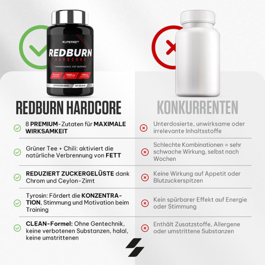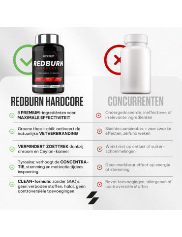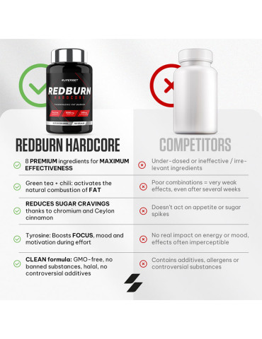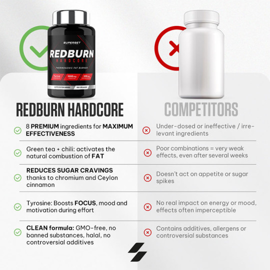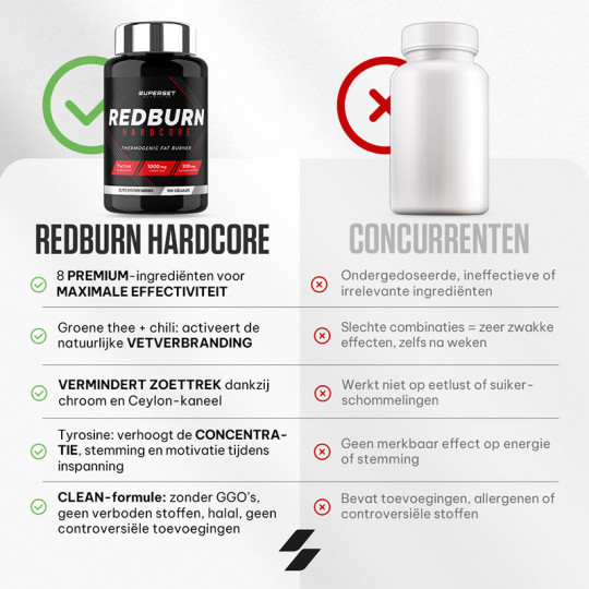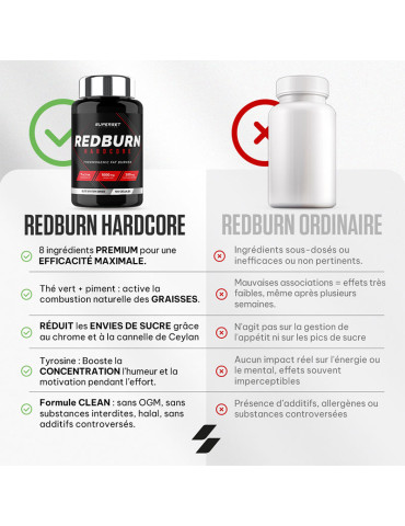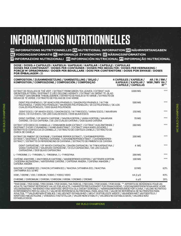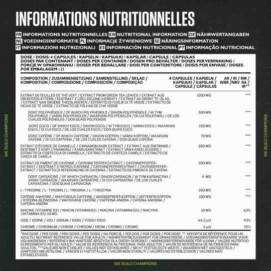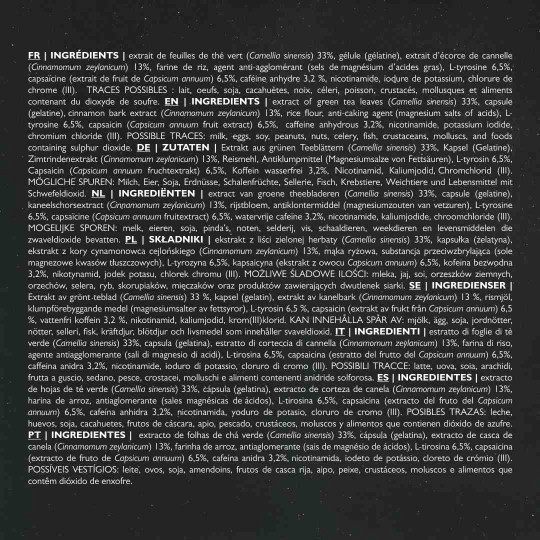 Ingrédients : extrait de feuilles de thé vert (Camellia sinensis) 33%, gélule (gélatine), extrait d’écorce de cannelle (Cinnamomum zeylanicum) 13%, farine de riz, agent anti-agglomérant (sels de magnésium d'acides gras), L-tyrosine 6,5%, capsaïcine (extrait de fruit de Capsicum annuum) 6,5%, cafeine anhydre 3,2 %, nicotinamide, iodure de potassium, chlorure de chrome (III).