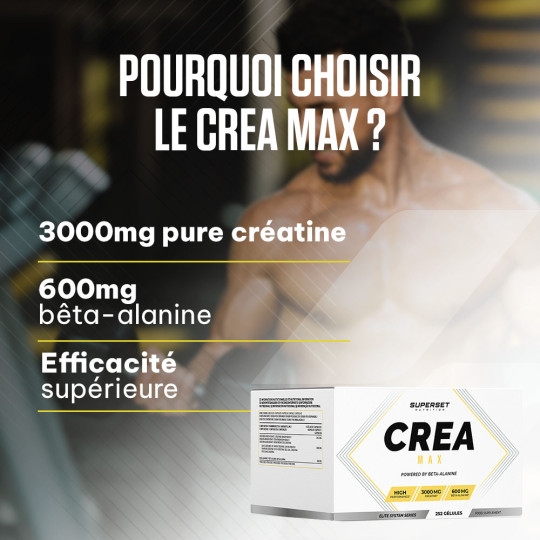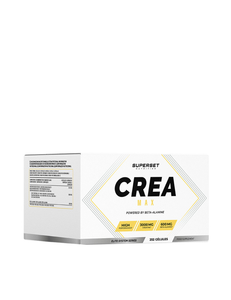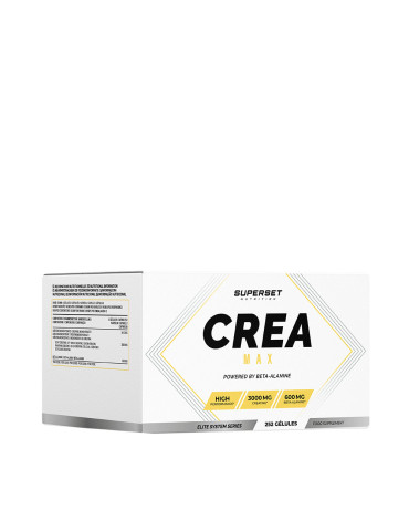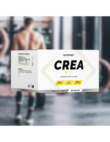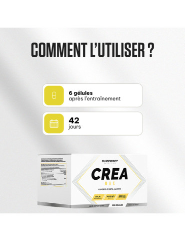 Ingrédients : créatine monohydrate 72%, gélule (gélatine), beta-alanine 13%, anti-agglomérant (sels de magnésium d'acides gras).