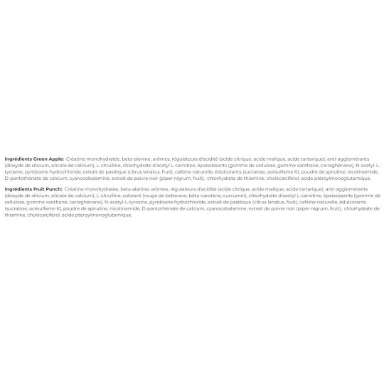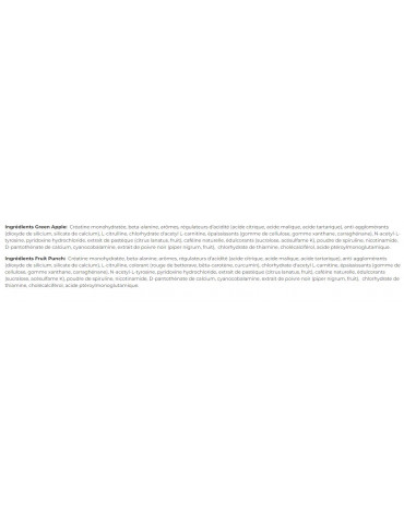 Ingrédients Green Apple: Créatine monohydratée, beta-alanine, arômes, régulateurs d’acidité (acide citrique, acide malique, acide tartarique), anti-agglomérants (dioxyde de silicium, silicate de calcium), L-citrulline, chlorhydrate d'acetyl L-carnitine, épaississants (gomme de cellulose, gomme xanthane, carraghénane), N-acetyl-L-tyrosine, pyridoxine hydrochloride, extrait de pastèque (citrus lanatus, fruit), caféine naturelle, édulcorants (sucralose, acésulfame K), poudre de spiruline, nicotinamide, D-pantothénate de calcium, cyanocobalamine, extrait de poivre noir (piper nigrum, fruit), chlorhydrate de thiamine, cholécalciférol, acide ptéroylmonoglutamique.
