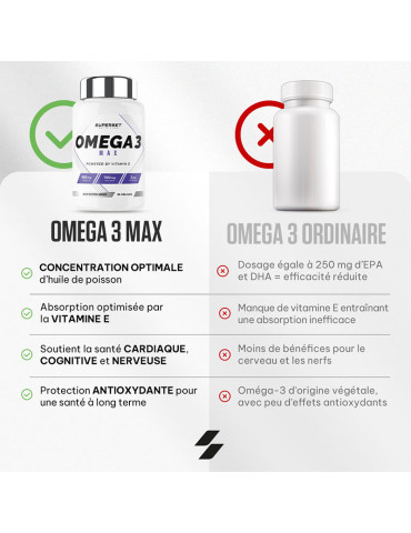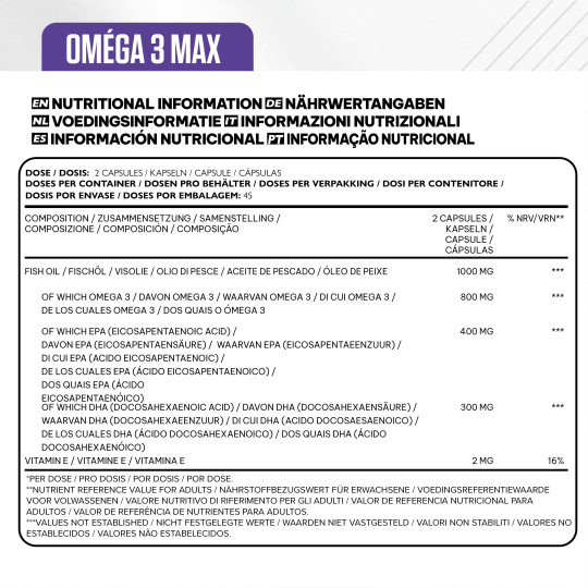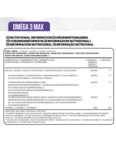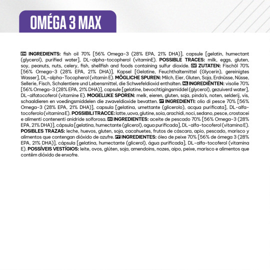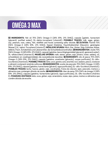 Ingrédients : Huile de poisson 70% [56% OMÉGA-3 (28% EPA, 21% DHA)], capsule [gélatine bovine, humectant (glycérol), eau purifiée] vitamine E (dl-alpha-tocophérol).