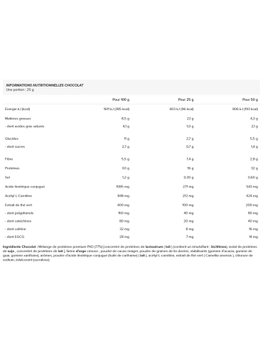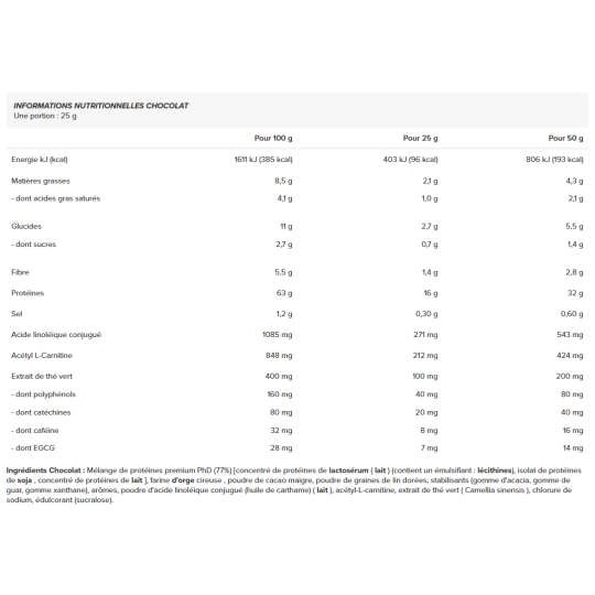 Ingrédients Chocolat : Mélange de protéines premium PhD (77%) [concentré de protéines de lactosérum ( lait ) (contient un émulsifiant : lécithines), isolat de protéines de soja , concentré de protéines de lait ], farine d'orge cireuse , poudre de cacao maigre, poudre de graines de lin dorées, stabilisants (gomme d'acacia, gomme de guar, gomme xanthane), arômes, poudre d'acide linoléique conjugué (huile de carthame) ( lait ), acétyl-L-carnitine, extrait de thé vert ( Camellia sinensis ), chlorure de sodium, édulcorant (sucralose).