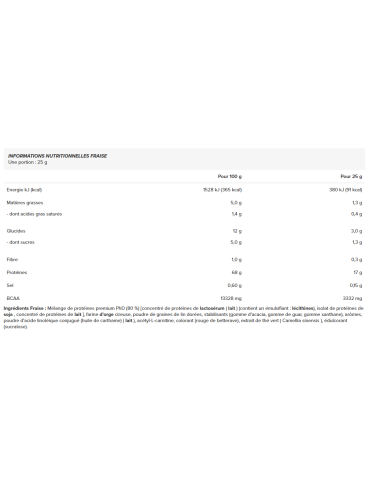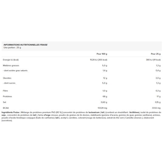 Ingrédients Fraise : Mélange de protéines premium PhD (80 %) [concentré de protéines de lactosérum ( lait ) (contient un émulsifiant : lécithines), isolat de protéines de soja , concentré de protéines de lait ], farine d'orge cireuse, poudre de graines de lin dorées, stabilisants (gomme d'acacia, gomme de guar, gomme xanthane), arômes, poudre d'acide linoléique conjugué (huile de carthame) ( lait ), acétyl-L-carnitine, colorant (rouge de betterave), extrait de thé vert ( Camellia sinensis ), édulcorant (sucralose).
