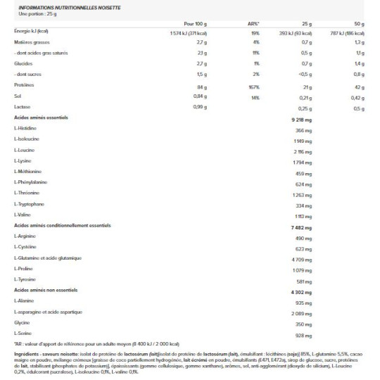 Ingrédients Noisette : isolat de protéines de lactosérum 87% [isolat de protéines de lactosérum, émulsifiant : lécithines (soja) isolat de protéines de lactosérum, émulsifiant : lécithines (soja)], poudre de cacao dégraissée, crème [graisse de noix de coco partiellement hydrogénée, lait écrémé, lait écrémé en poudre, émulsifiants (E471, E472a), sirop de glucose, saccharose, protéines de lait, stabilisateur (phosphates de potassium), anti-agglomérant (phosphates de calcium)], (phosphates de calcium)], L-Glutamine 2,5%, émulsifiant : lécithines (soja), épaississants (carraghénane, gomme xanthane), arômes, sel, anti-agglomérant (dioxyde de silicium), L-Leucine 0,2%, édulcorant (sucralose), L-Isoleucine 0,1%, L-Valine 0,1%