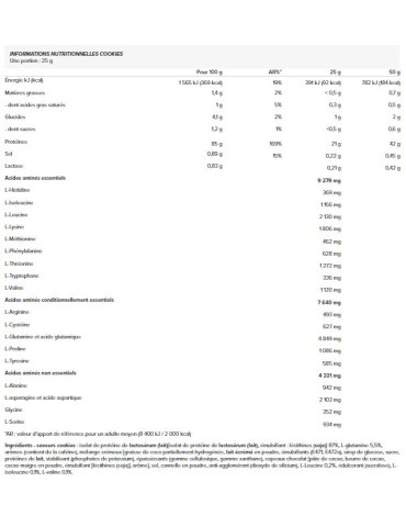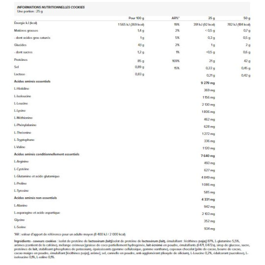 Ingrédients - saveurs cookies : isolat de protéine de lactosérum (lait)[isolat de protéine de lactosérum (lait), émulsifiant : lécithines (soja)] 87%, L-glutamine 5,5%, arômes (contient de la caféine), mélange crémeux [graisse de coco partiellement hydrogénée, lait écrémé en poudre, émulsifiants (E471, E472a), sirop de glucose, sucre, protéines de lait, stabilisant (phosphates de potassium), épaississants (gomme cellulosique, gomme xanthane), copeaux chocolat [pâte de cacao, beurre de cacao, cacao maigre en poudre, émulsifiant [lécithines (soja)], arôme], sel, cannelle en poudre, anti-agglomérant (dioxyde de silicium), L-Leucine 0,2%, édulcorant (sucralose), L-isoleucine 0,1%, L-valine 0,1%.