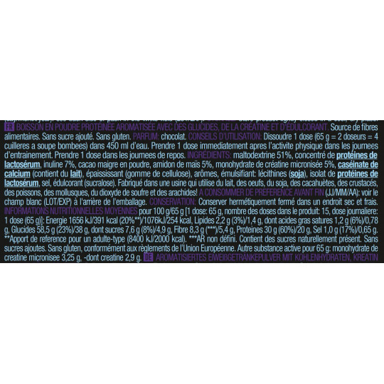 Ingrédients chocolat : maltodextrine 51%, concentré de protéines de lactosérum, inuline 7%, cacao maigre en poudre, amidon de maïs 5%, monohydrate de créatine micronisée 5%, caséinate de calcium (contient du lait), épaississant (gomme de cellulose), arômes, émulsifiant: lécithines (soja), isolat de protéines de lactosérum, sel, édulcorant (sucralose).