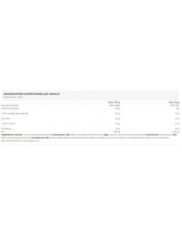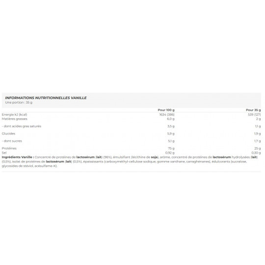 Ingrédients Vanille : Concentré de protéines de lactosérum (lait) (96%), émulsifiant (lécithine de soja), arôme, concentré de protéines de lactosérum hydrolysées (lait) (0,5%), isolat de protéines de lactosérum (lait) (0,5%), épaississants (carboxyméthyl-cellulose sodique, gomme xanthane, carraghénanes), édulcorants (sucralose, glycosides de stéviol, acésulfame-K).