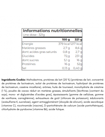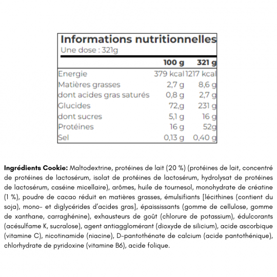 Maltodextrine, protéines de lait (20 %) (protéines de lait, concentré de protéines de lactosérum, isolat de protéines de lactosérum, hydrolysat de protéines de lactosérum, caséine micellaire), arômes, huile de tournesol, monohydrate de créatine (1 %), poudre de cacao réduit en matières grasses, émulsifiants [lécithines (contient du soja), mono- et diglycérides d’acides gras], épaississants (gomme de cellulose, gomme de xanthane, carraghénine), exhausteurs de goût (chlorure de potassium), édulcorants (acésulfame K, sucralose), agent antiagglomérant (dioxyde de silicium), acide ascorbique (vitamine C), nicotinamide (niacine), D-pantothénate de calcium (acide pantothénique), chlorhydrate de pyridoxine (vitamine B6), acide folique.