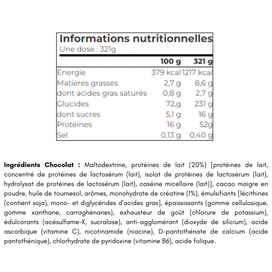 Maltodextrine, protéines de lait (20%) [protéines de lait, concentré de protéines de lactosérum (lait), isolat de protéines de lactosérum (lait), hydrolysat de protéines de lactosérum (lait), caséine micellaire (lait)], cacao maigre en poudre, huile de tournesol, arômes, monohydrate de créatine (1%), émulsifiants [lécithines (contient soja), mono- et diglycérides d’acides gras], épaississants (gomme cellulosique, gomme xanthane, carraghénanes), exhausteur de goût (chlorure de potassium), édulcorants (acésulfame-K, sucralose), anti-agglomérant (dioxyde de silicium), acide ascorbique (vitamine C), nicotinamide (niacine), D-pantothénate de calcium (acide pantothénique), chlorhydrate de pyridoxine (vitamine B6), acide folique.