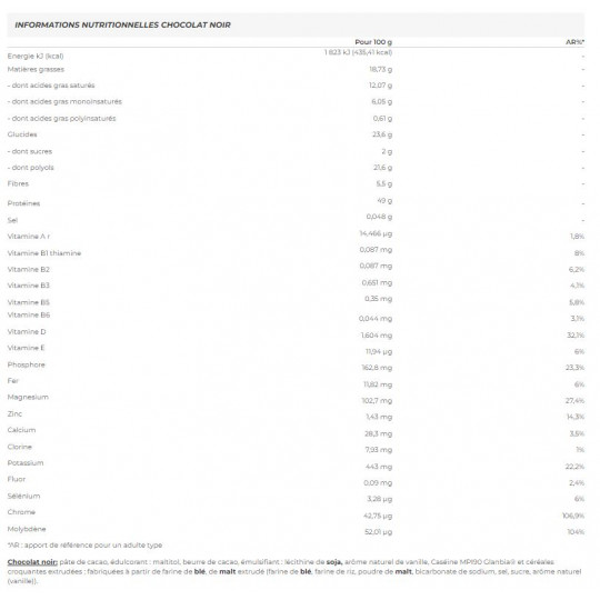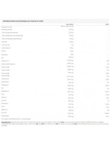 Chocolat noir: pâte de cacao, édulcorant : maltitol, beurre de cacao, émulsifiant : lécithine de soja, arôme naturel de vanille, Caséine MPI90 Glanbia® et céréales croquantes extrudées : fabriquées à partir de farine de blé, de malt extrudé (farine de blé, farine de riz, poudre de malt, bicarbonate de sodium, sel, sucre, arôme naturel (vanille)).