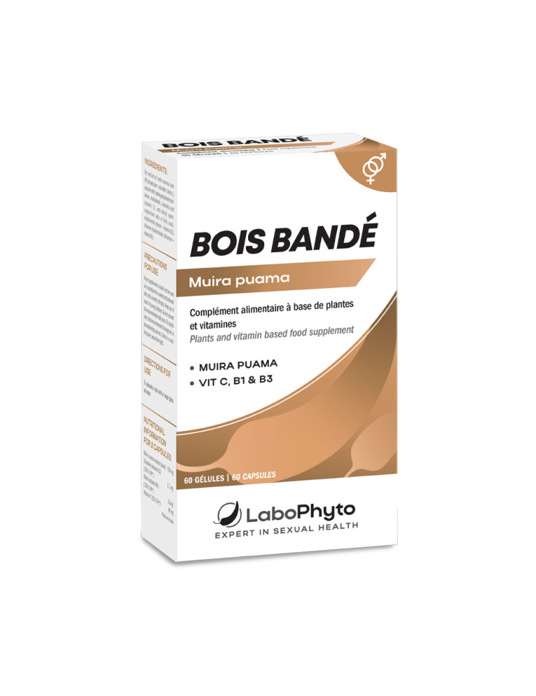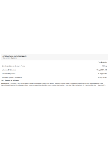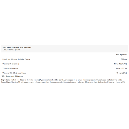Ingrédients : Extrait sec d'écorce de muira puama (Ptychopetalum olacoides Benth.), enveloppe de la gélule : hydroxypropylméthylcellulose, maltodextrine, acide Lascorbique (vitamine C), anti-agglomérant : sels de magnésium d’acides gras, nicotinamide (niacine = vitamine B3), chlorhydrate de thiamine (thiamine = vitamine B1).