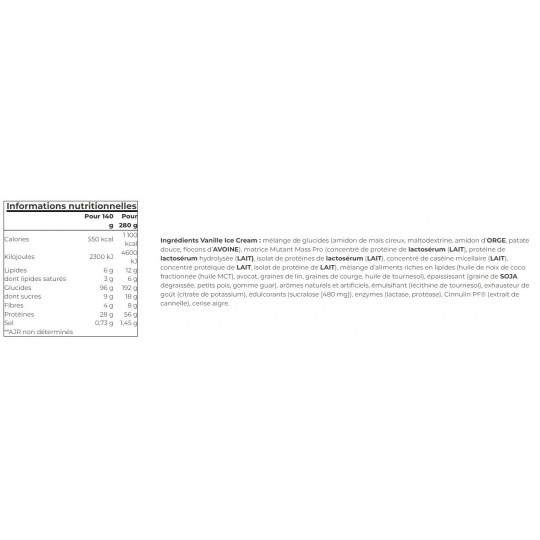 Ingrédients Vanille Ice Cream : mélange de glucides (amidon de maïs cireux, maltodextrine, amidon d’ORGE, patate douce, flocons d’AVOINE), matrice Mutant Mass Pro (concentré de protéine de lactosérum (LAIT), protéine de lactosérum hydrolysée (LAIT), isolat de protéines de lactosérum (LAIT), concentré de caséine micellaire (LAIT), concentré protéique de LAIT, isolat de protéine de LAIT), mélange d’aliments riches en lipides (huile de noix de coco fractionnée (huile MCT), avocat, graines de lin, graines de courge, huile de tournesol), épaississant (graine de SOJA dégraissée, petits pois, gomme guar), arômes naturels et artificiels, émulsifiant (lécithine de tournesol), exhausteur de goût (citrate de potassium), édulcorants (sucralose [480 mg]), enzymes (lactase, protéase), Cinnulin PF® (extrait de cannelle), cerise aigre.