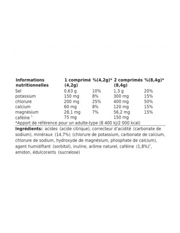 Ingrédients Pink Grapefruit: Acidifiant (acide citrique), régulateur d'acidité (carbonates de sodium), chlorure de potassium, humectant (sorbitol), inuline, carbonate de calcium, chlorure de sodium (CH: sel), caféine (75 mg/comprimé), hydroxyde de magnésium, arôme naturel, tricalcium phosphate, amidon, édulcorant (sucralose), maltodextrine, jus de betterave rouge en poudre, colorant (lutéine).
