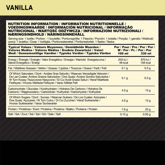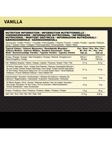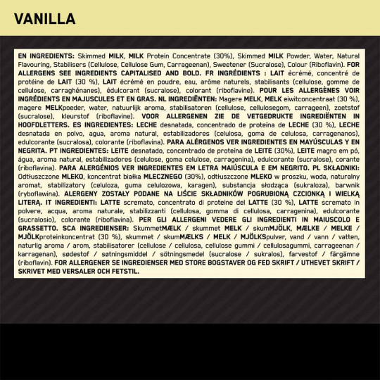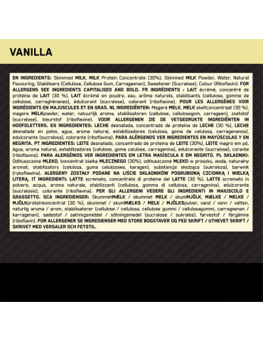 Ingrédients Vanille : Lait écrémé (80%), eau, concentré de protéine de lait (5.8%), arôme, stabilisants (gomme de gellane, carraghénanes), correcteur d'acidité (citrate trisodique), colorant (curcumine), édulcorant (sucralose).