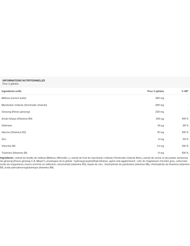 Ingrédients : extrait de feuille de mélisse (Melissa officinalis L.), extrait de fruit de myrobolan chébule (Terminalia chebula Retz.), extrait de racine et de parties aériennes de ginseng (Panax ginseng C.A. Meyer*), enveloppe de la gélule : hydroxypropylméthylcellulose, agent anti-agglomérant : sels de magnésium d’acides gras, carbonate acide de magnésium, levure enrichie en sélénium, niacinamide (vitamine B3), oxyde de zinc, chlorhydrate de pyridoxine (vitamine B6), chlorhydrate de thiamine (vitamine B1), acide ptéroylmonoglutamique (vitamine B9).