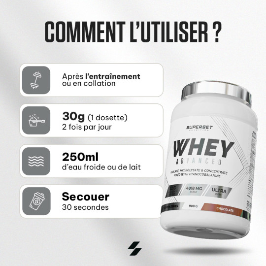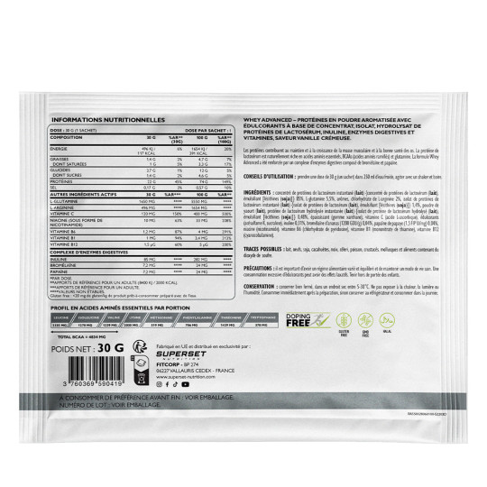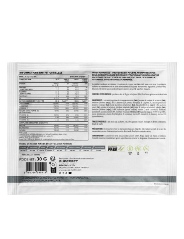 Ingrédients Vanille crémeuse : concentré de protéines de lactosérum instantané (lait) {concentré de protéines de lactosérum (lait), émulsifiant [lécithines (soja)]} 85%, L-glutamine 5,5%, arômes, chlorhydrate de L-arginine 2%, isolat de protéines de lactosérum instantané (lait) {isolat de protéines de lactosérum (lait), émulsifiant [lécithines (soja)]} 1,4%, poudre de yaourt (lait), protéine de lactosérum hydrolysée instantanée (lait) {isolat de protéine de lactosérum hydrolysé (lait), émulsifiant [lécithines (soja)]} 0,48%, épaississant (gomme xanthane), vitamine C (acide L-ascorbique), édulcorants (acésulfame K, sucralose), inuline 0,31%, bromélaïne d’ananas (1200 GDU/g) 0,04%, papaïne de papaye (1,5 FIP U/mg) 0,04%, niacine (nicotinamide), vitamine B6 (chlorhydrate de pyridoxine), vitamine B1 (mononitrate de thiamine), vitamine B12 (cyanocobalamine).