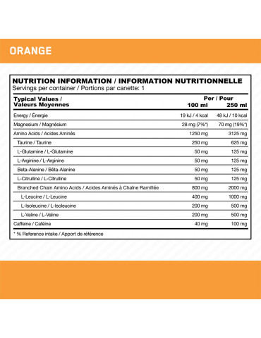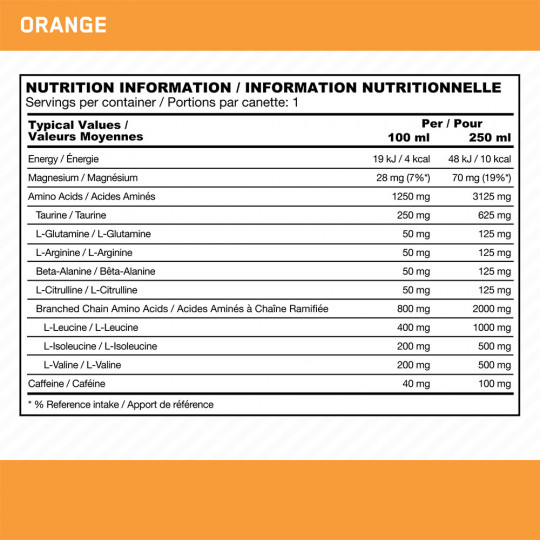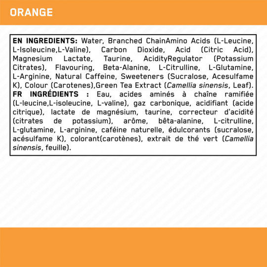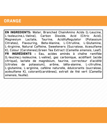 Ingrédients Orange : eau, acides aminés à chaîne ramifiée (L-Leucine, L-Isoleucine, L-Valine), dioxyde de carbone, acide (acide citrique), lactate de magnésium, taurine, régulateur d'acidité (citrates de potassium), arômes, bêta-alanine, L-Citrulline, L-Glutamine, L-Arginine, L-tyrosine, caféine naturelle, édulcorants (sucralose, acésulfame-K), colorant (carotènes), extrait de thé vert (camellia sinensis, feuille).
