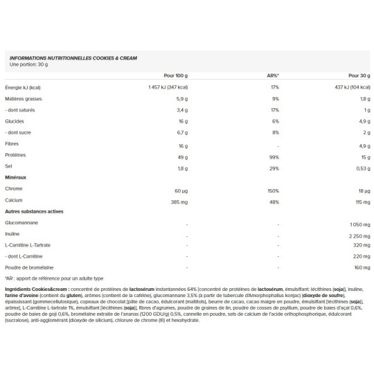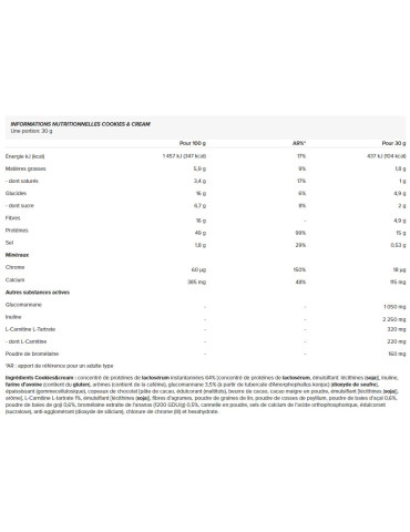 Ingrédients Cookies&cream : concentré de protéines de lactosérum instantannées 64% [concentré de protéines de lactosérum, émulsifiant: lécithines (soja)], inuline, farine d’avoine (contient du gluten), arômes (contient de la caféine), glucomannane 3,5% (à partir de tubercule d'Amorphophallus konjac) (dioxyde de soufre), épaississant (gommecellulosique), copeaux de chocolat [pâte de cacao, édulcorant (maltitols), beurre de cacao, cacao maigre en poudre, émulsifiant [lécithines (soja)], arôme], L-Carnitine L-tartrate 1%, émulsifiant [lécithines (soja)], fibres d'agrumes, poudre de graines de lin, poudre de cosses de psyllium, poudre de baies d'açaï 0,6%, poudre de baies de goji 0,6%, bromélaïne extraite de l'ananas (1200 GDU/g) 0,5%, cannelle en poudre, sels de calcium de l'acide orthophosphorique, édulcorant (sucralose), anti-agglomérant (dioxyde de silicium), chlorure de chrome (III) et hexahydrate.