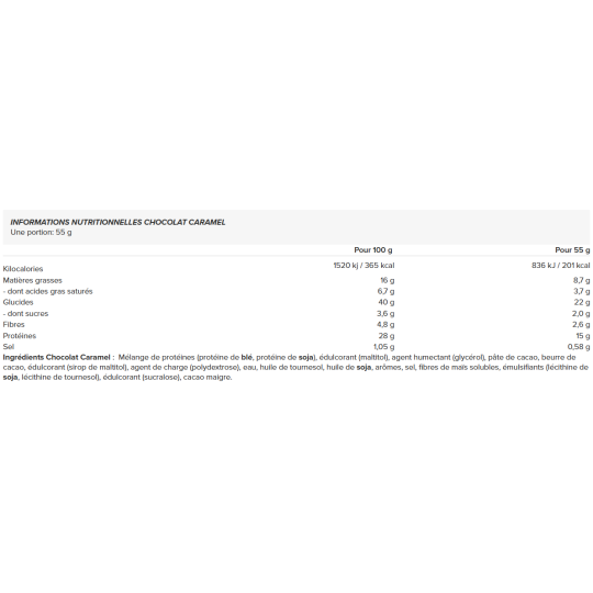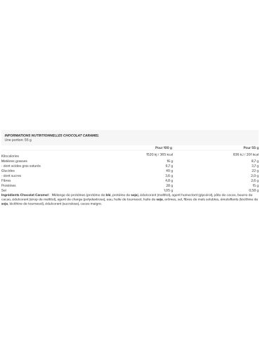 Ingrédients Chocolat Caramel : Mélange de protéines (protéine de blé, protéine de soja), édulcorant (maltitol), agent humectant (glycérol), pâte de cacao, beurre de cacao, édulcorant (sirop de maltitol), agent de charge (polydextrose), eau, huile de tournesol, huile de soja, arômes, sel, fibres de maïs solubles, émulsifiants (lécithine de soja, lécithine de tournesol), édulcorant (sucralose), cacao maigre.