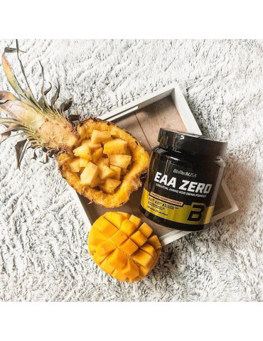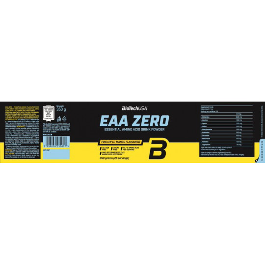 Ingrédients Ananas mangue : L-Glutamine (25,6%), L-Leucine instantanée (L-Leucine, émulsifiant : lécithines, maltodextrine), (11,4%), chlorhydrate de L-Lysine (10,7%), arômes, acide (acide citrique), L-Valine (7,4%), L-Phénylalanine (7,1%), L-Isoleucine (5,7%), L-Thréonine (4,3%), chlorhydrate de L-Histidine (3,5%), L-Méthionine (2,9%), L-Tryptophane (1,1%), édulcorant (sucralose), sel, colorants (Tartrazine, Allura Red AC*).