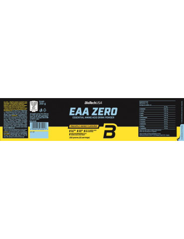 Ingrédients Citron : L-Glutamine (25,6%), L-Leucine instantanée (L-Leucine, émulsifiant : lécithines, maltodextrine) (11,4%), chlorhydrate de L-Lysine (10,7%), acide (acide citrique), arômes, L-Valine (7,4%), L-Phénylalanine (7,1%), L-Isoleucine (5,7%), L-Thréonine (4,3%), chlorhydrate de L-Histidine (3,5%), L-Méthionine (2,9%), L-Tryptophane (1,1%), édulcorant (sucralose).