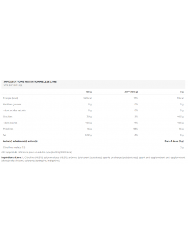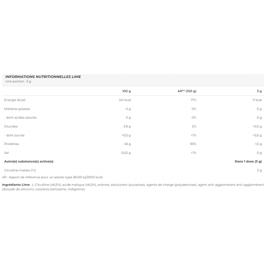 Ingrédients Lime : L-Citrulline (46,5%), acide malique (46,5%), arômes, édulcorant (sucralose), agents de charge (polydextrose), agent anti-agglomérant anti-agglomérant (dioxyde de silicium), colorants (tartrazine*, indigotine).