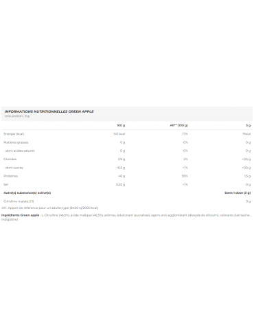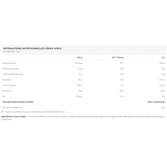 Ingrédients Green apple : L-Citrulline (46,5%), acide malique (46,5%), arômes, édulcorant (sucralose), agent anti-agglomérant (dioxyde de silicium), colorants (tartrazine* , indigotine).
