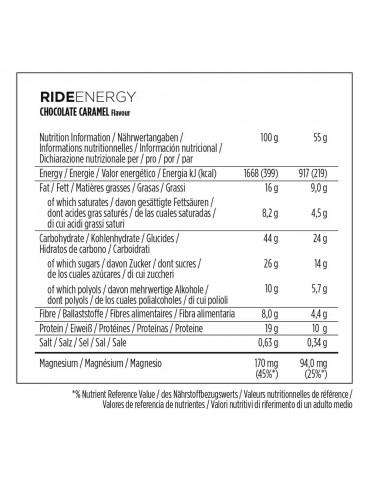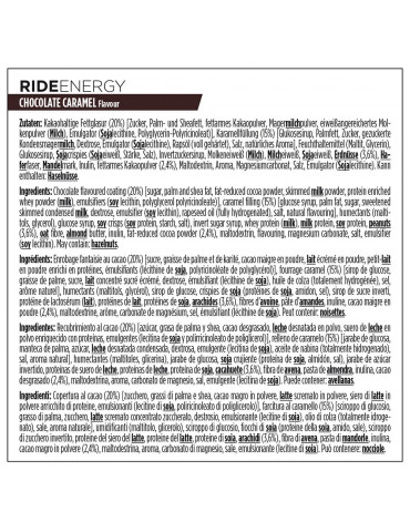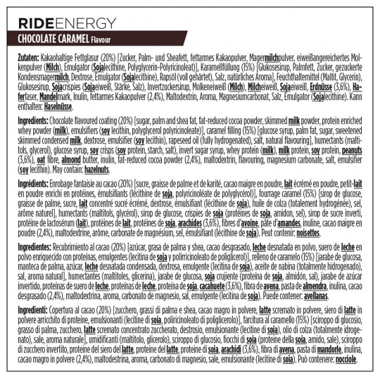 Ingrédients Choco Caramel : enrobage aromatisé au cacao (20%) [sucre, graisse de palme, graisse de karité, cacao maigre en poudre, lait écrémé en poudre, poudre de lactosérum enrichi aux protéines, émulsifiant (lécithine de soja, polyricinoléate de polyglycérol))], fourrage caramel (15%) [sirop de glucose, graisse de palme, sucre, lait concentré écrémé sucré, dextrose, émulsifiant (lécithine de soja), huile de colza (entièrement hydrogénée), sel, arôme naturel], humectant (maltitol, glycérol), sirop de glucose, morceaux croustillants de soja (protéine de soja, amidon, sel), sirop de sucre inverti, protéine de lactosérum (lait), protéine de lait, protéine de soja, arachides (3,6%), fibres d'avoine, pâte d’amande, inuline, cacao maigre en poudre (2,4%), maltodextrine, arômes, carbonate de magnésium, sel, émulsifiant (lécithine de soja).