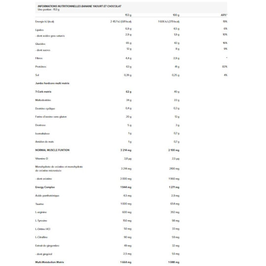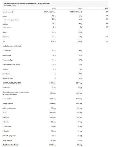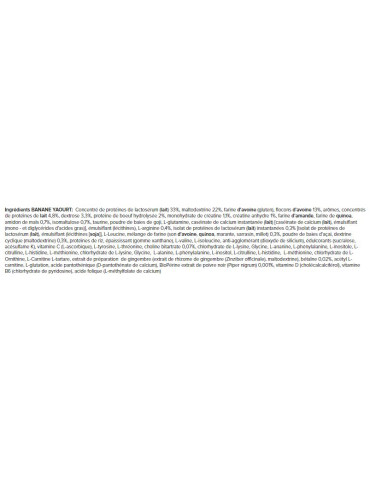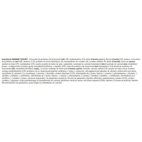 Ingrédients BANANE YAOURT: Concentré de protéines de lactosérum (lait) 33%, maltodextrine 22%, farine d'avoine (gluten), flocons d'avoine 13%, arômes, concentrés de protéines de lait 4,8%, dextrose 3,3%, protéine de boeuf hydrolysée 2%, monohydrate de créatine 1,1%, créatine anhydre 1%, farine d'amande, farine de quinoa, amidon de maïs 0,7%, isomaltulose 0,7%, taurine, poudre de baies de goji, L-glutamine, caséinate de calcium instantanée (lait) [caséinate de calcium (lait), émulsifiant (mono - et diglycérides d'acides gras)], émulsifiant (lécithines), L-arginine 0,4%, isolat de protéines de lactosérum (lait) instantanées 0,3% [isolat de protéines de lactosérum (lait), émulsifiant (lécithines [soja]], L-Leucine, mélange de farine (son d'avoine, quinoa, marante, sarrasin, millet) 0,3%, poudre de baies d'açai, dextrine cyclique (maltodextrine) 0,3%, protéines de riz, épaississant (gomme xanthane), L-valine, L-isoleucine, anti-agglomérant (dioxyde de silicium), édulcorants (sucralose, acésulfame K), vitamine C (L-ascorbique), L-tyrosine, L-thréonine, choline bitartrate 0,07%, chlorhydrate de L-lysine, Glycine, L-ananine, L-phénylalanine, L-inositole, L-citrulline, L-histidine, L-méthionine, chlorhydrate de L-lysine, Glycine, L-alanine, L-phénylalanine, L-inositol, L-citrulline, L-histidine, L-méthionine, chlorhydrate de L-Ornithine, L-Carnitine L-tartare, extrait de préparation de gingembre (extrait de rhizome de gingembre (Zinziber officinale), maltodextrine), bétaïne 0,02%, acétyl L-carnitine, L-glutation, acide pantothénique (D-pantothénate de calcium), BioPérine extrait de poivre noir (Piper nigrum) 0,001%, vitamine D (cholécalcalciférol), vitamine B6 (chlorhydrate de pyridosine), acide folique (L-méthylfolate de calcium)