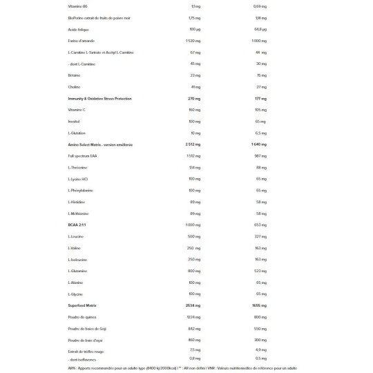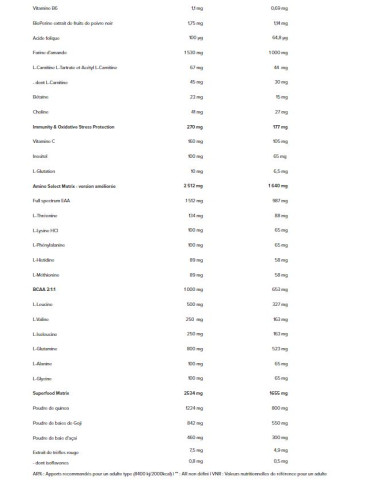 Ingrédients Chocolat : Concentré de protéines de lactosérum (lait) 33%, maltodextrine 22%, farine d'avoine (gluten) 13%, cacao maigre en poudre, concentrés de protéines de lait 4,8%, dextrose 3,3%, protéine de boeuf hydrolysée 2%, monohydrate de créatine 1,1%, créatine anhydre 1%, farine d'amande, farine de quinoa, amidon de maïs 0,7%, isomaltulose 0,7%, taurine, poudre de baies de goji, L-glutamine, caséinate de calcium instantanée (lait) [caséinate de calcium (lait), émulsifiant (mono - et diglycérides d'acides gras)], émulsifiant (lécithines), L-arginine 0,4%, isolat de protéines de lactosérum (lait) instantanées 0,3% [isolat de protéines de lactosérum (lait), émulsifiant (lécithines [soja]], L-Leucine, mélange de farine (son d'avoine, quinoa, amarante, sarrasin, millet) 0,3%, poudre de baies d'açai, dextrine cyclique (maltodextrine) 0,3%, protéines de riz, épaississant (gomme xanthane), L-valine, L-isoleucine, anti-agglomérant (dioxyde de silicium), édulcorants (sucralose, acésulfame K), vitamine C (L-ascorbique), L-tyrosine, L-thréonine, choline bitartrate 0,07%, chlorhydrate de L-lysine, Glycine, L-ananine, L-phénylalanine, L-inositole, L-citrulline, L-histidine, L-méthionine, chlorhydrate de L-lysine, Glycine, L-alanine, L-phénylalanine, L-inositol, L-citrulline, L-histidine, L-méthionine, chlorhydrate de L-Ornithine, L-Carnitine L-tartare, extrait de préparation de gingembre (extrait de rhizome de gingembre (Zinziber officinale), maltodextrine), bétaïne 0,02%, acétyl L-carnitine, L-glutation, acide pantothénique (D-pantothénate de calcium), BioPérine extrait de poivre noir (Piper nigrum) 0,001%, vitamine D (cholécalcalciférol), vitamine B6 (chlorhydrate de pyridosine), acide folique (L-méthylfolate de calcium)