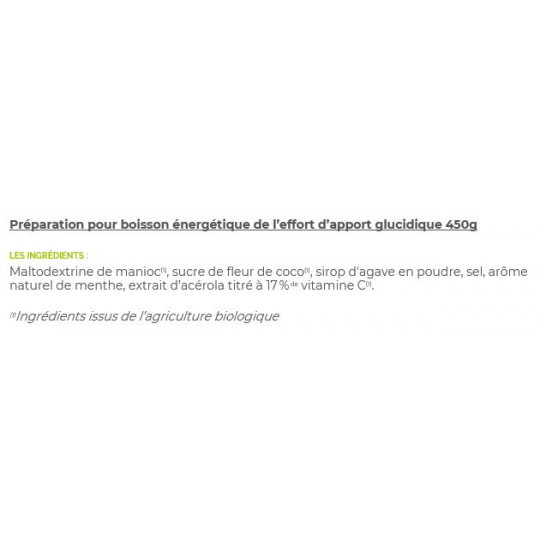 Ingrédients - saveur menthe : sirop de manioc déshydraté D.E 10(1), sucre de fleur de coco(1), sirop d'agave en poudre (1), sel, arôme naturel de menthe (1), extrait d’acérola titré à 17 % de vitamine C(1). (1)Ingrédients issus de l’agriculture biologique