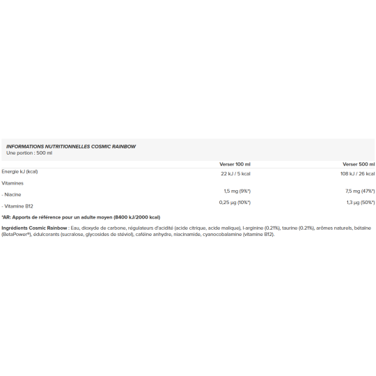 Ingrédients Cosmic Rainbow : Eau, dioxyde de carbone, régulateurs d'acidité (acide citrique, acide malique), l-arginine (0.21%), taurine (0.21%), arômes naturels, bétaïne (BetaPower®), édulcorants (sucralose, glycosides de stéviol), caféine anhydre, niacinamide, cyanocobalamine (vitamine B12).