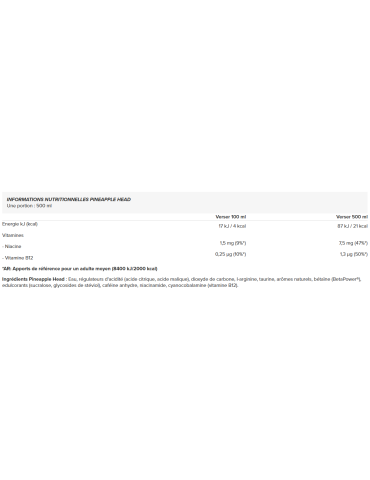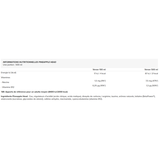 Ingrédients Pineapple Head : Eau, régulateurs d'acidité (acide citrique, acide malique), dioxyde de carbone, l-arginine, taurine, arômes naturels, bétaïne (BetaPower®), edulcorants (sucralose, glycosides de stéviol), caféine anhydre, niacinamide, cyanocobalamine (vitamine B12).