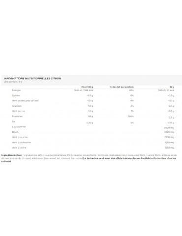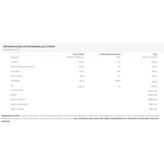 Ingrédients citron : L-glutamine 42%, l-leucine instantanée 21% (L-leucine, émulsifiants : lécithines, maltodextrine), l-isoleucine 10,4%, l-valine 10,4%, arômes, acide alimentaire (acide citrique), édulcorant (sucralose), sel, colorant (tartrazine)(La tartrazine peut avoir des effets indésirables sur l'activité et l'attention chez les enfants).