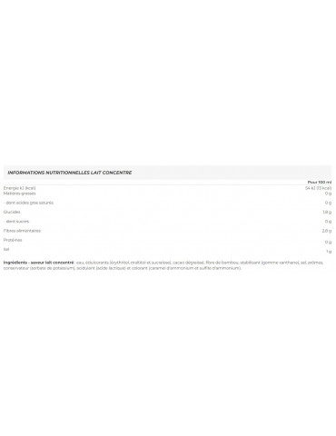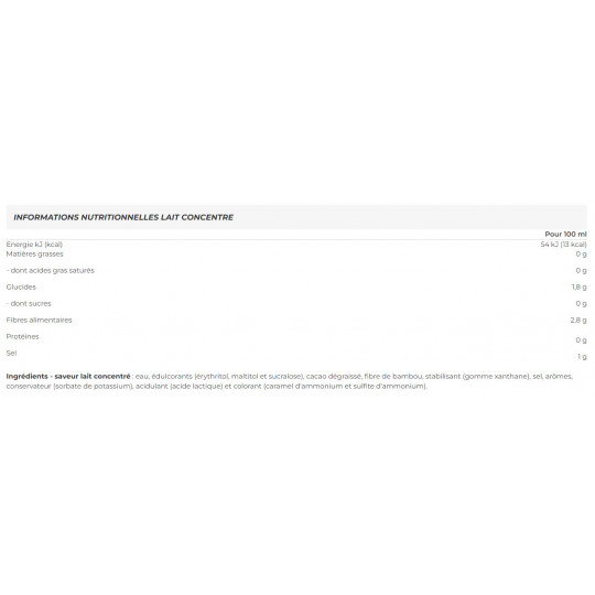 Ingrédients - saveur lait concentré : eau, édulcorants (érythritol, maltitol et sucralose), cacao dégraissé, fibre de bambou, stabilisant (gomme xanthane), sel, arômes, conservateur (sorbate de potassium), acidulant (acide lactique) et colorant (caramel d'ammonium et sulfite d'ammonium).