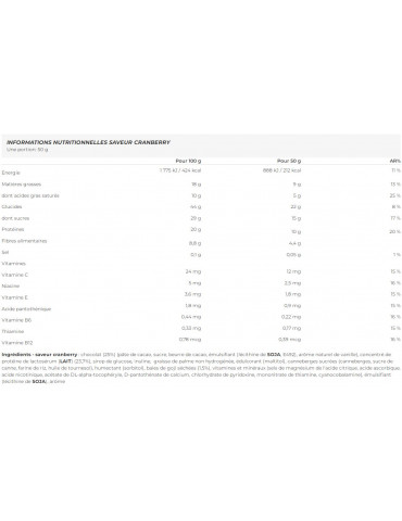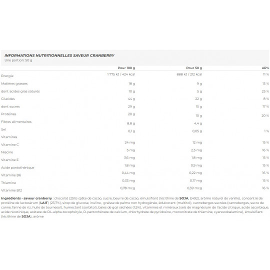 Ingrédients - saveur cranberry : chocolat (25%) (pâte de cacao, sucre, beurre de cacao, émulsifiant (lécithine de SOJA, E492), arôme naturel de vanille), concentré de protéine de LACTOSERUM (LAIT) (23,7%), sirop de glucose, inuline, graisse de palme non hydrogénée, édulcorant (maltitol), canneberges sucrées (canneberges, sucre de canne, farine de riz, huile de tournesol), humectant (sorbitol), baies de goji séchées (1,5%), vitamines et minéraux (sels de magnésium de l'acide citrique, acide ascorbique, acide nicotinique, acétate de DL-alpha-tocophéryle, D-pantothénate de calcium, chlorhydrate de pyridoxine, mononitrate de thiamine, cyanocobalamine), émulsifiant (lécithine de SOJA), arôme.