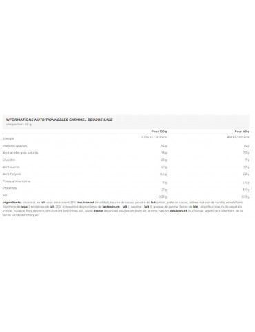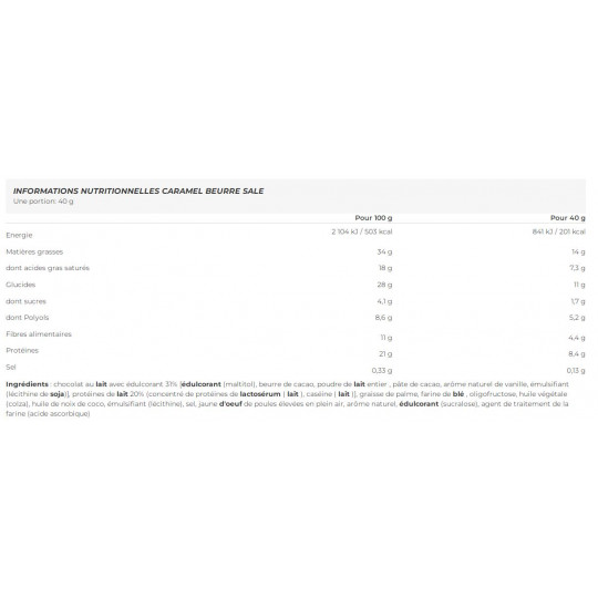 Ingrédients : chocolat au lait avec édulcorant 31% [édulcorant (maltitol), beurre de cacao, poudre de lait entier, pâte de cacao, arôme naturel de vanille, émulsifiant (lécithine de soja)], protéines de lait 20% (concentré de protéines de lactosérum ( lait ), caséine ( lait )], graisse de palme, farine de blé, oligofructose, huile végétale (colza), huile de noix de coco, émulsifiant (lécithine), sel, jaune d'oeuf de poules élevées en plein air, arôme naturel, édulcorant (sucralose), agent de traitement de la farine (acide ascorbique)