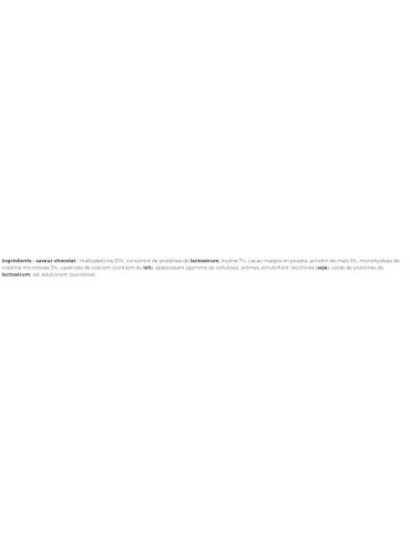 Ingrédients - saveur chocolat : maltodextrine 51%, concentré de protéines de lactosérum, inuline 7%, cacao maigre en poudre, amidon de maïs 5%, monohydrate de créatine micronisée 5%, caséinate de calcium (contient du lait), épaississant (gomme de cellulose), arômes, émulsifiant : lécithines (soja), isolat de protéines de lactosérum, sel, édulcorant (sucralose).