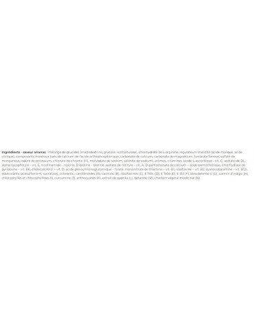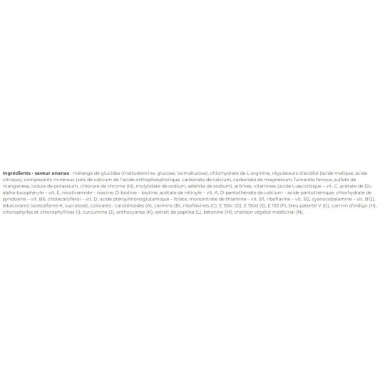 Ingrédients - saveur ananas : mélange de glucides (maltodextrine, glucose, isomaltulose), chlorhydrate de L-arginine, régulateurs d'acidité (acide malique, acide citrique), composants minéraux (sels de calcium de l'acide orthophosphorique, carbonate de calcium, carbonate de magnésium, fumarate ferreux, sulfate de manganèse, iodure de potassium, chlorure de chrome (III), molybdate de sodium, sélénite de sodium), arômes, vitamines (acide L-ascorbique – vit. C, acétate de DL-alpha-tocophéryle – vit. E, nicotinamide – niacine, D-biotine – biotine, acétate de rétinyle – vit. A, D-pantothénate de calcium – acide pantothénique, chlorhydrate de pyridoxine – vit. B6, cholécalciférol – vit. D, acide ptéroylmonoglutamique – folate, mononitrate de thiamine – vit. B1, riboflavine – vit. B2, cyanocobalamine – vit. B12), édulcorants (acésulfame-K, sucralose), colorants : caroténoïdes (A), carmins (B), riboflavines (C), E 150c (D), E 150d (E), E 133 (F), bleu patenté V (G), carmin d’indigo (H), chlorophylles et chlorophyllines (I), curcumine (J), anthocyanes (K), extrait de paprika (L), bétanine (M), charbon végétal médicinal (N).
