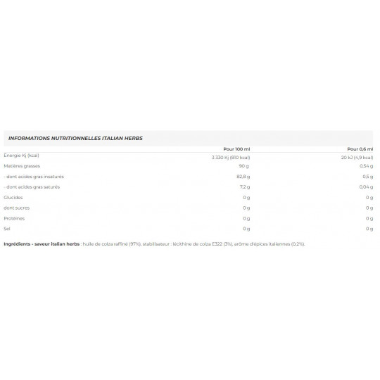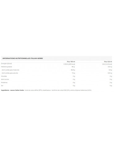 Ingrédients - saveur italian herbs : huile de colza raffiné (97%), stabilisateur : lécithine de colza E322 (3%), arôme d'épices italiennes (0,2%).