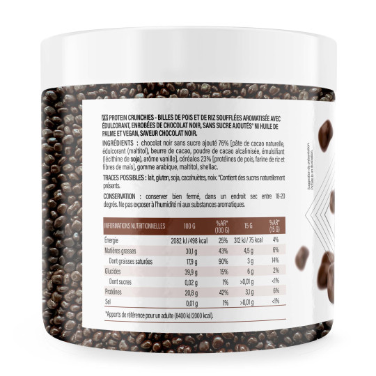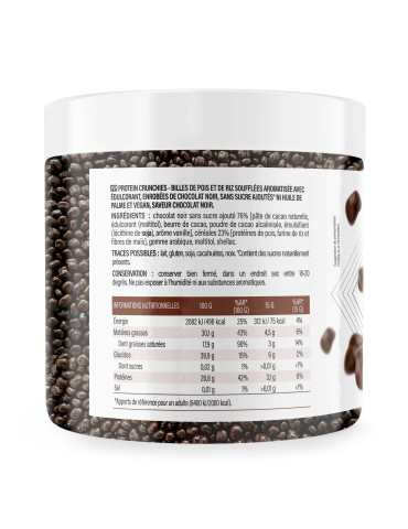 Ingrédients : chocolat noir sans sucre ajouté 76% [pâte de cacao, édulcorant (maltitol), beurre de cacao, poudre de cacao alcalinisée, émulsifiant (lécithine de SOJA), arôme vanille], céréales 23% [protéines de pois, farine de riz et fibres de maïs], gomme arabique, maltitol, shellac.