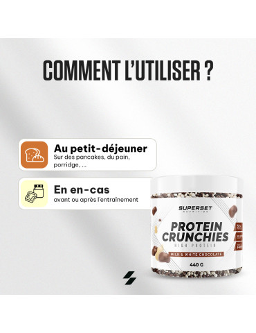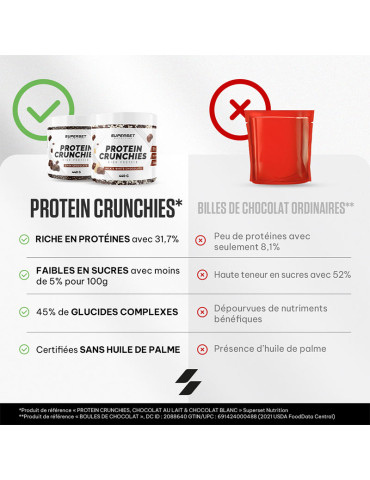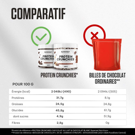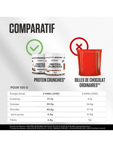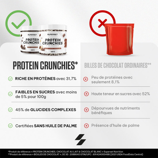 Ingrédients : chocolat : enrobage chocolat 65% [beurre de cacao, pâte de cacao, édulcorant (maltitol), LAIT écrémé en poudre, lécithine de SOJA, arôme vanille], 35% de céréales [protéines de pois, farine de riz, arôme chocolat, sel marin]. Chocolat blanc : Enrobage chocolat blanc 65% [beurre de cacao, pâte de cacao, édulcorant (maltitol), LAIT écrémé en poudre, lécithine de SOJA, arôme vanille], 35% de céréales [protéines de pois, farine de riz, arôme, chocolat, sel marin].