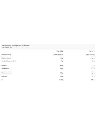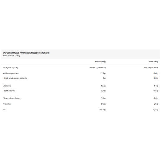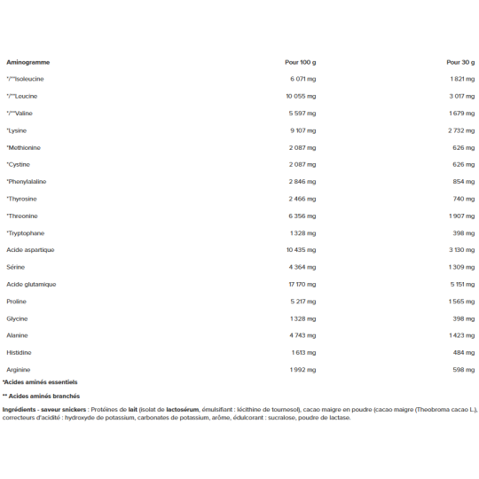Ingrédients - saveur snickers : Protéines de lait (isolat de lactosérum, émulsifiant : lécithine de tournesol), cacao maigre en poudre (cacao maigre (Theobroma cacao L.), correcteurs d'acidité : hydroxyde de potassium, carbonates de potassium, arôme, édulcorant : sucralose, poudre de lactase.