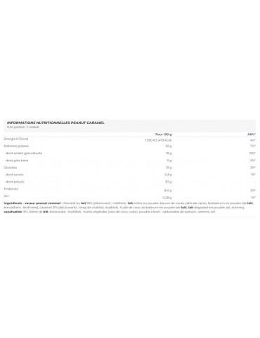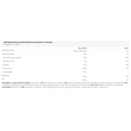 Ingrédients - saveur peanut caramel : chocolat au lait 35% [édulcorant : maltitols ; lait entier en poudre, beurre de cacao, pâte de cacao, lactosérum en poudre (de lait), émulsifiant : lécithines], caramel 31% [édulcorants : sirop de maltitol, maltitols ; huile de coco, lactosérum en poudre (de lait), lait dégraissé en poudre, sel, arômes], cacahuètes 13%, farine de blé, édulcorant : maltitols ; huiles végétales (noix de coco, colza), poudre à lever : carbonates de sodium ; arômes, sel.