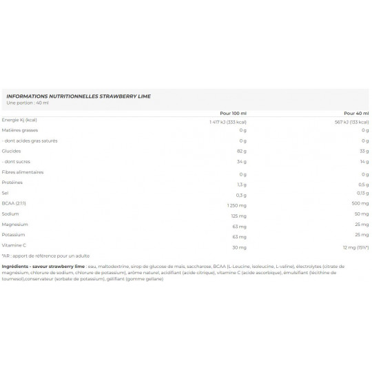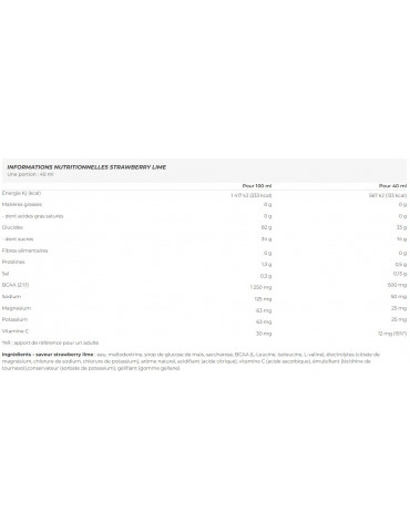 Ingrédients - saveur strawberry lime : eau, maltodextrine, sirop de glucose de maïs, saccharose, BCAA (L-Leucine, isoleucine, L-valine), électrolytes (citrate de magnésium, chlorure de sodium, chlorure de potassium), arôme naturel, acidifiant (acide citrique), vitamine C (acide ascorbique), émulsifiant (lécithine de tournesol), conservateur (sorbate de potassium), gélifiant (gomme gellane).